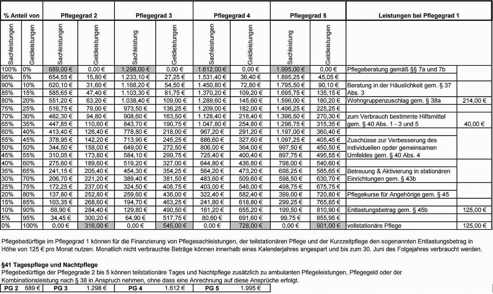 Der Anspruch auf den zusätzlichen Entlastungsbetrag wurde auf 125,00 € für jeden Pflegebedürftigen festgesetzt (bisher 104,00 € oder 208,00 €). Dieser Leistungsbetrag ist für alle Pflegegrade identisch. Er dient der Erstattung von Aufwendungen, die den Versicherten entstehen, im Zusammenhang mit der Inanspruchnahme von Leistungen